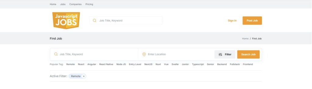 - A strong remote component, with a dedicated “Remote JavaScript Jobs” section.