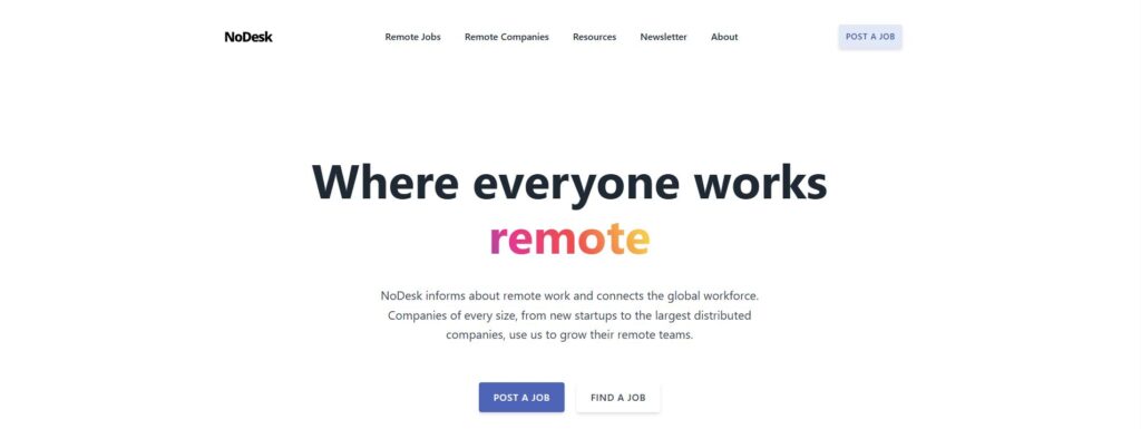 NoDesk is a platform that helps companies build remote‐first teams and aids job‐seekers in finding remote work. It offers a job board of remote roles, a directory of remote‐friendly companies, and resources about remote work.